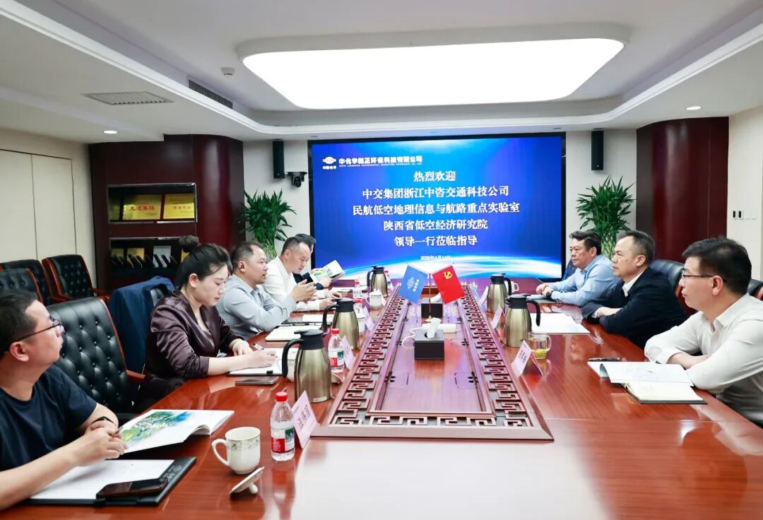 4月14日,中国化学城投公司朗正公司总经理朱龙海与中交集团浙江中咨交通科技有限公司党支部书记、执行董事杨华振,中国民航局低空地理信息与航路重点实验室副主任谭翔一行进行座谈交流。