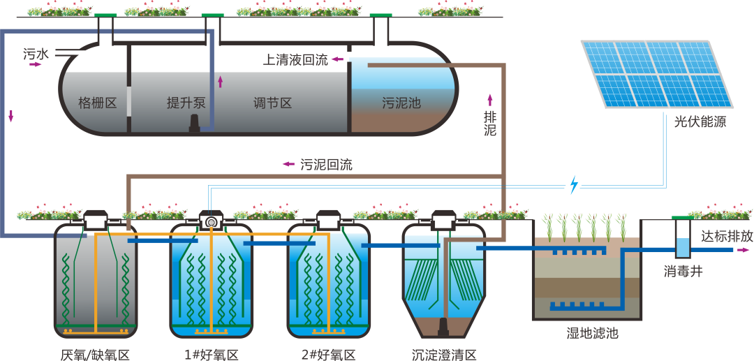 项目建成后,具有运行成本低、污染物去除效率高,出水水质稳定、运维管理可视化等特点,可减少有机污染物、总氮、总磷的排放,实现主要水污染物总量减排目标。同时,处理站出水排入氧化塘,非灌溉季时,作为污水处理的消纳场所,可用于道路浇洒、景观绿化等用途,实现了资源化利用、节约水资源的目的。
