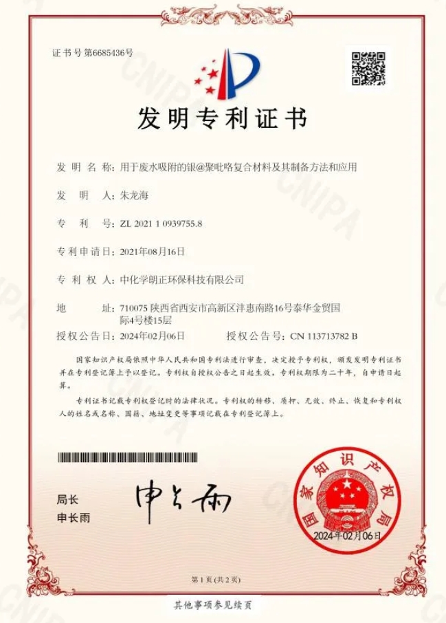 近日,由中国化学所属朗正公司申请的《用于废水吸附的银@聚吡咯复合材料及其制备方法和应用》发明专利获国家知识产权局正式授权(专利号:ZL 2021 1 0939755.8)。