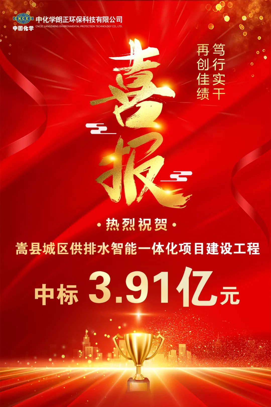 新年开新局,实干促发展。值此农历新春佳节来临之际,中化学朗正环保科技有限公司喜中2024年首个项目--河南嵩县城区供排水智能一体化项目建设工程,中标金额3.91亿元,总工期15个月。 项目位于河南省嵩县城区,以EPC总承包模式